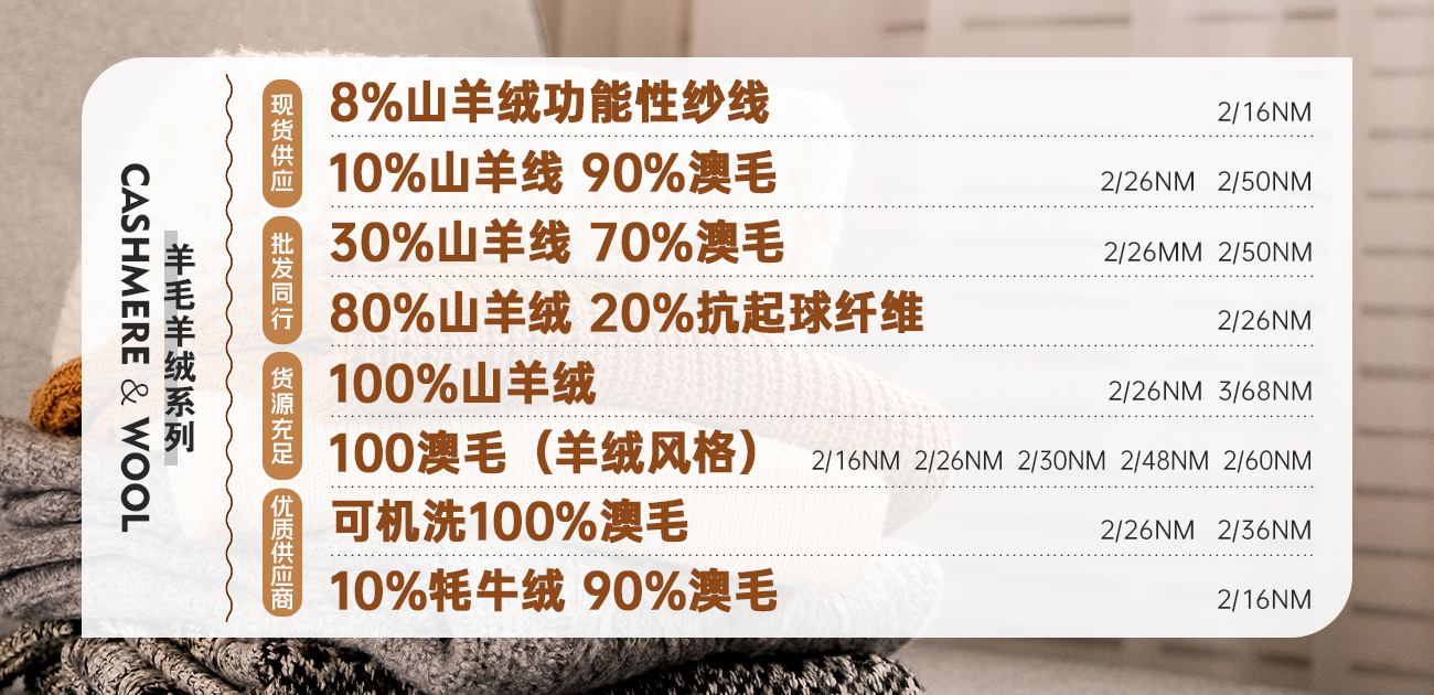 成分:5%山羊绒 95%美丽诺羊绒 /5%山羊绒 50%美丽诺羊毛 30%尼龙 15%粘胶